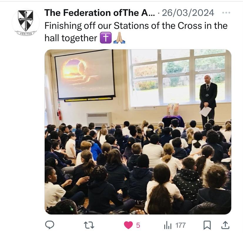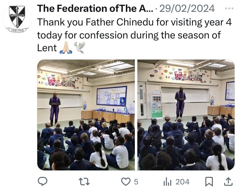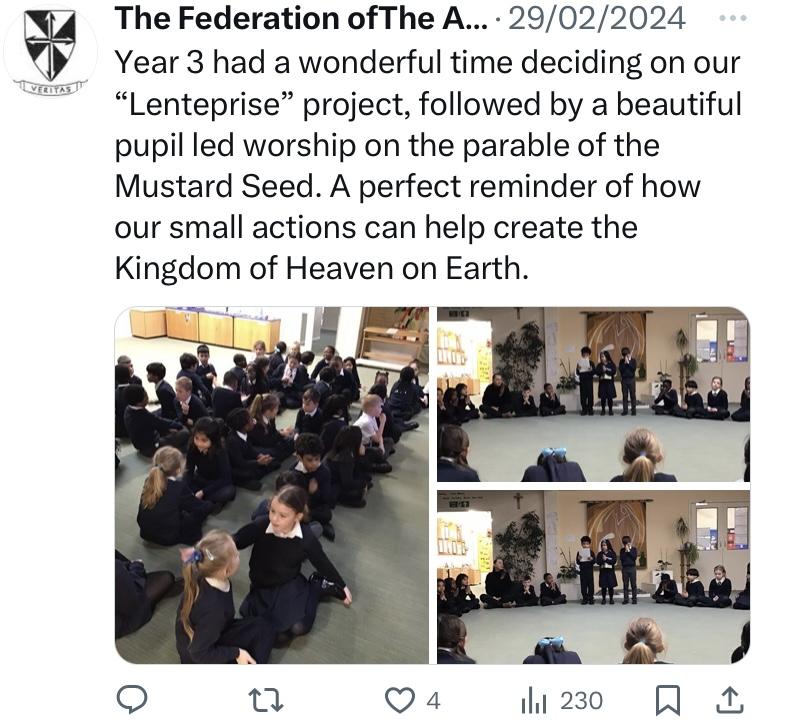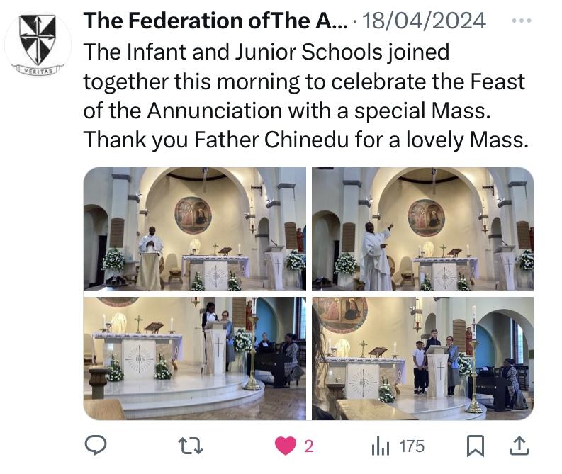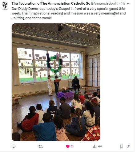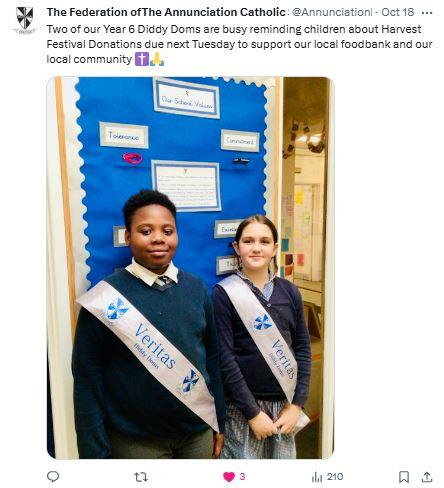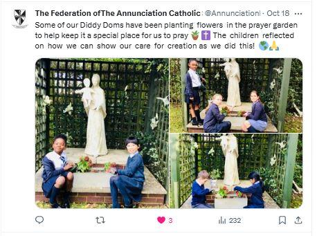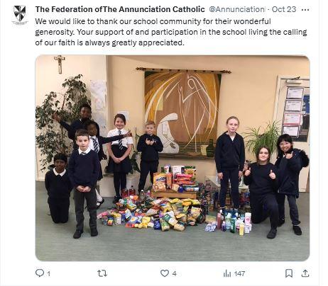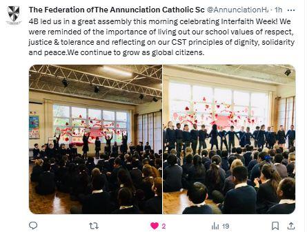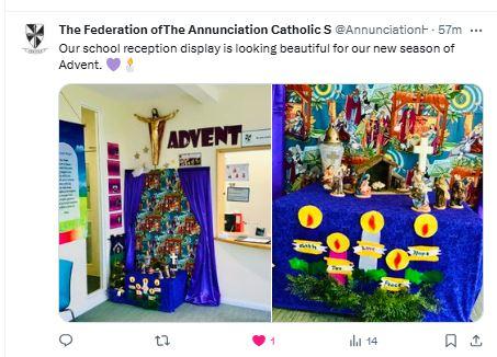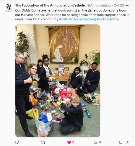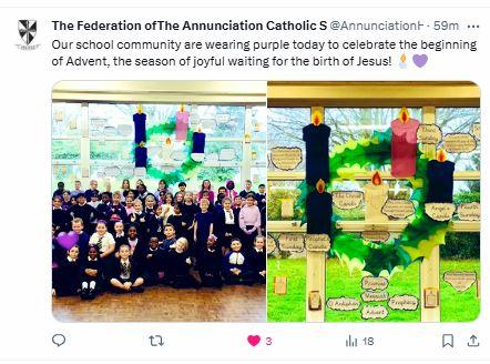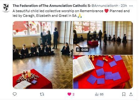 At The Federation of The Annunciation Catholic Schools, our school mission statement is the foundation of the Catholic Life and lived mission of the school. We endeavour to instil in our pupils that our faith calls us to love God and to love our neighbours in every situation, especially our sisters and brothers living in poverty or other challenging situations. Following in the footsteps of Christ, we hope to make present in our unjust and broken world, the justice, love and peace of God. It is by doing so that we truly become who God meant us to be and in turn spread the flame of his love through the world.