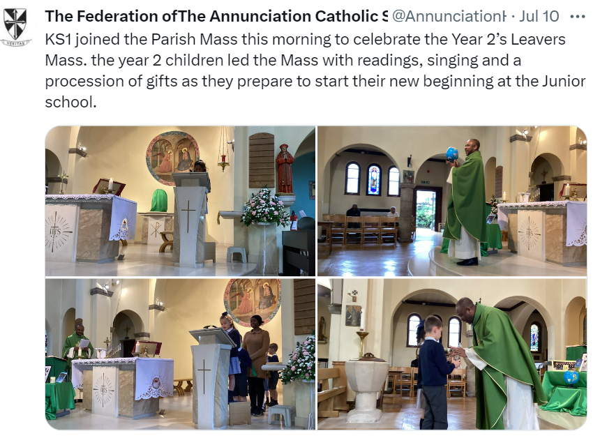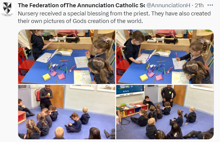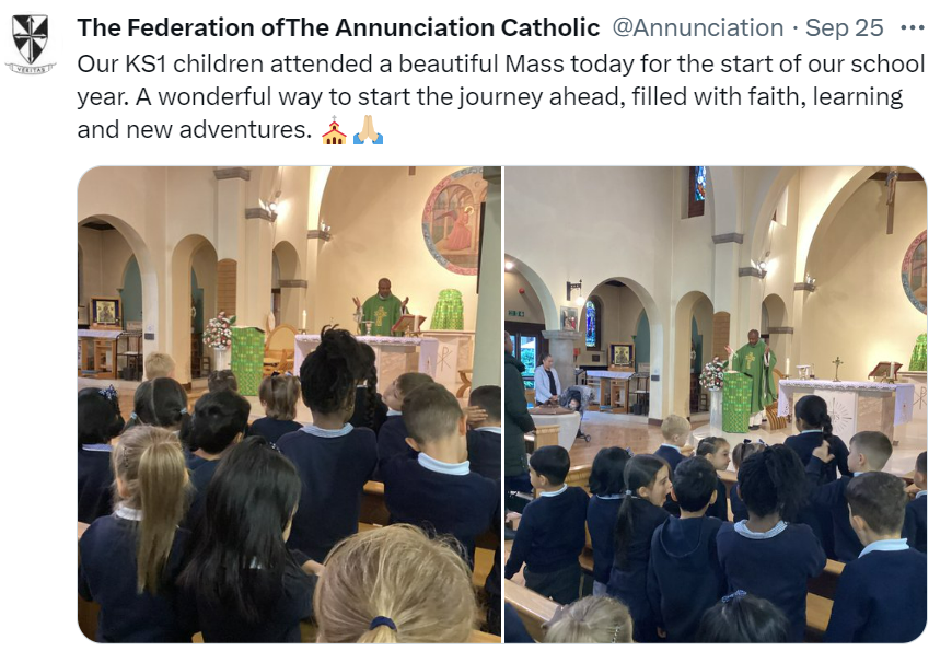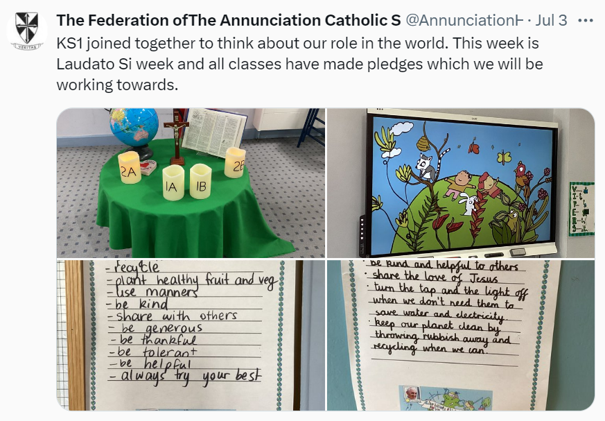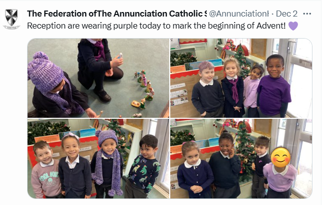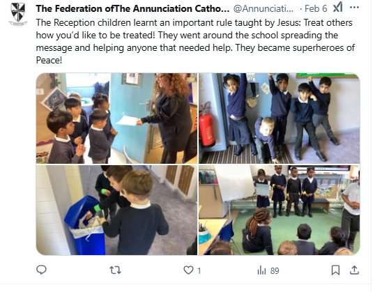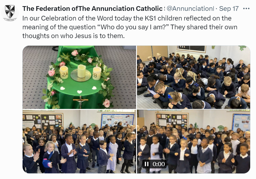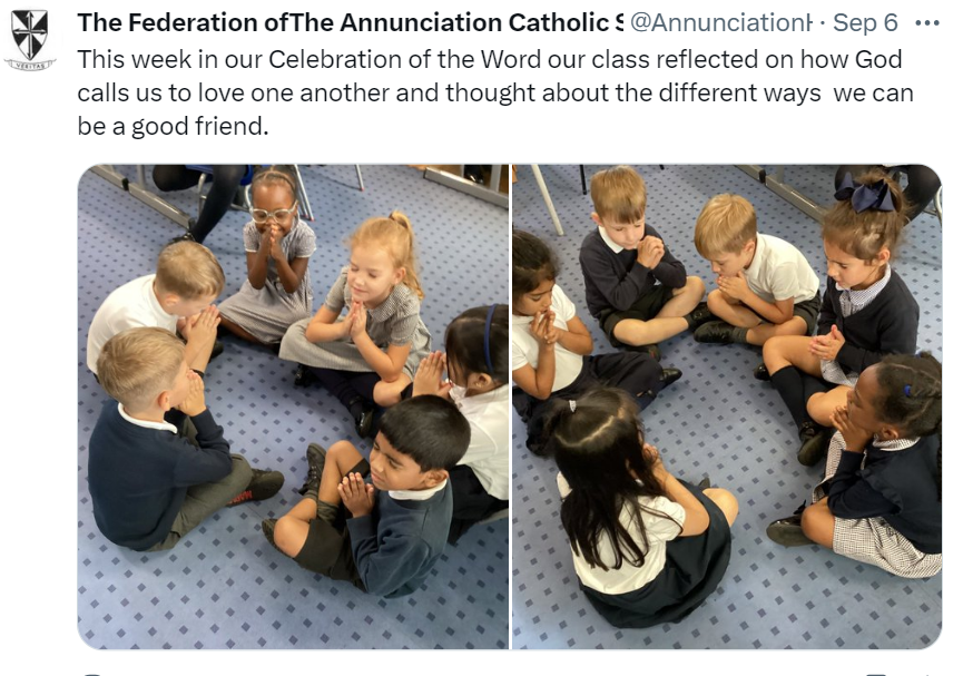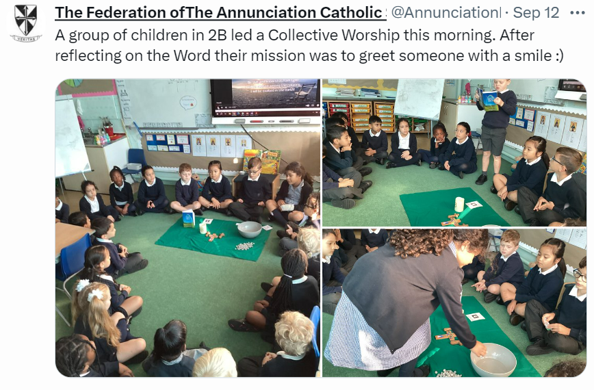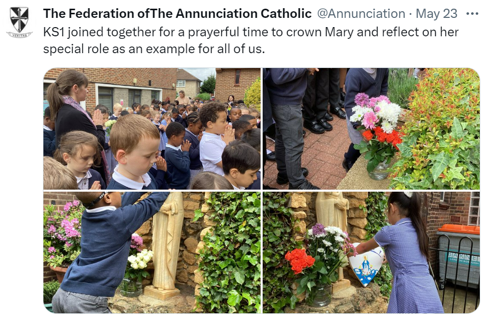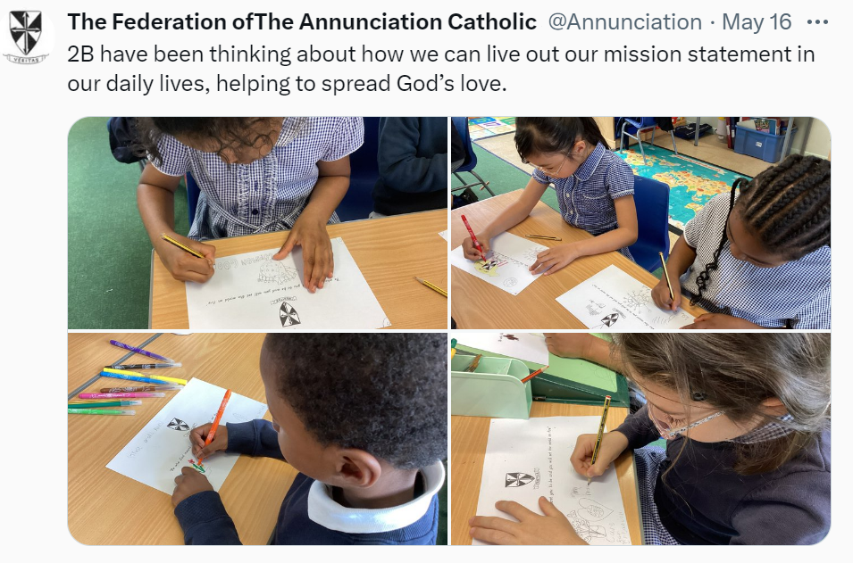 At The Federation of The Annunciation Catholic Schools, our school mission statement is the foundation of the Catholic Life and lived mission of the school. We endeavour to instil in our pupils that our faith calls us to love God and to love our neighbours in every situation, especially our sisters and brothers living in poverty or other challenging situations. Following in the footsteps of Christ, we hope to make present in our unjust and broken world, the justice, love and peace of God. It is by doing so that we truly become who God meant us to be and in turn spread the flame of his love through the world.