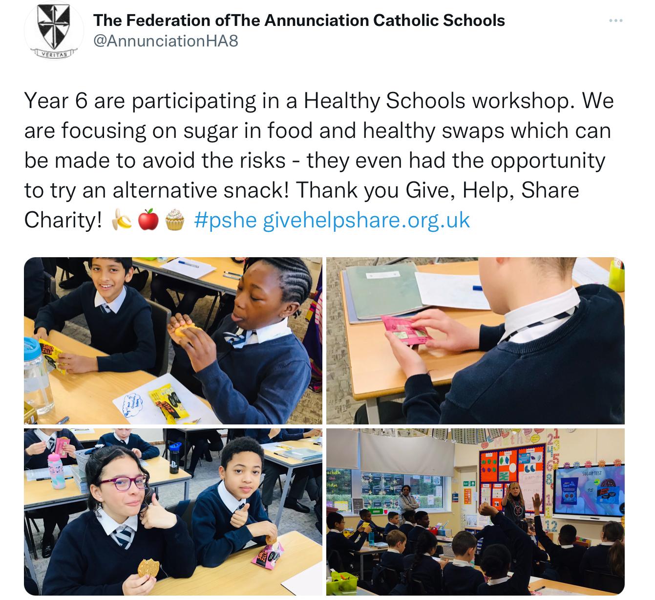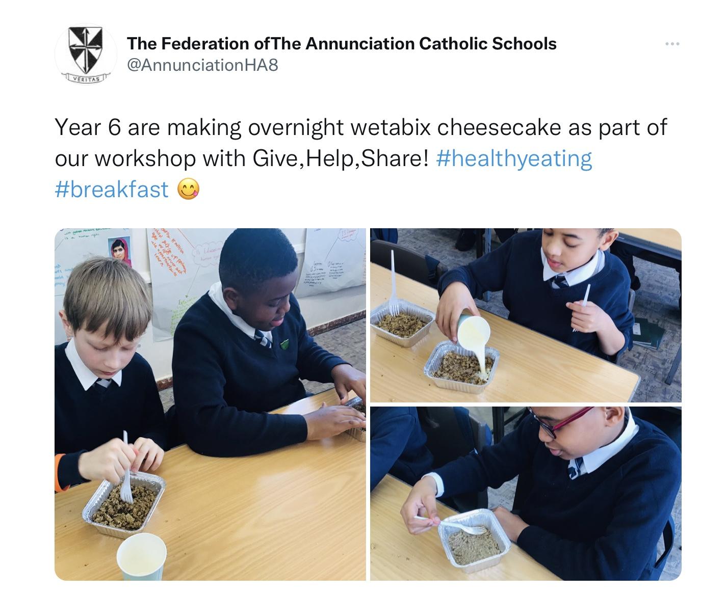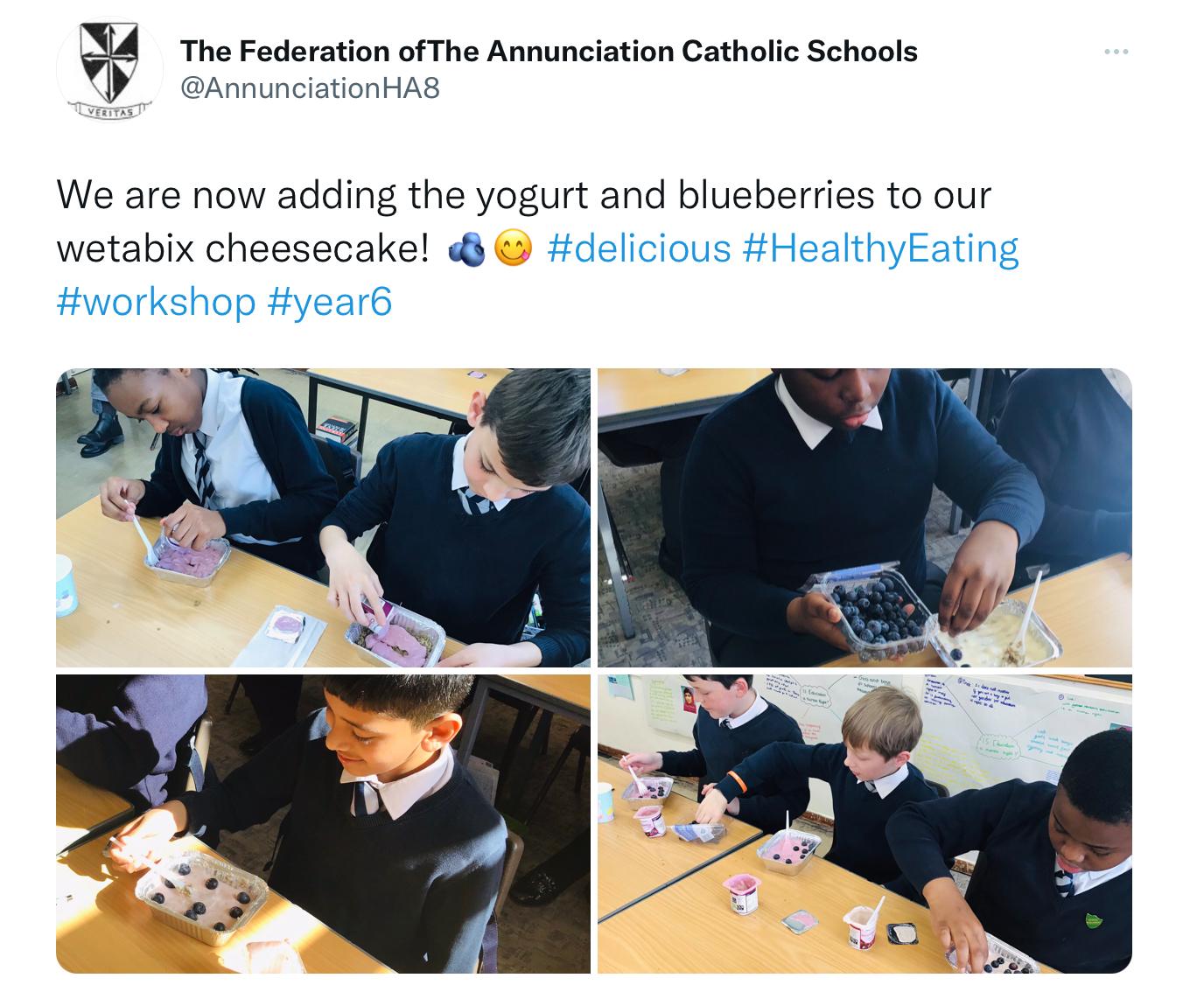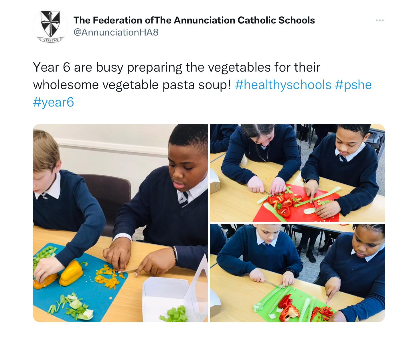 •    To highlight the importance of healthy eating, we use annual Roots 2 Food workshops in which children can identify where certain foods come from and how to make healthy choices. They make delicious recipes that they then make at home with their families, which strengthens the home/school link.
