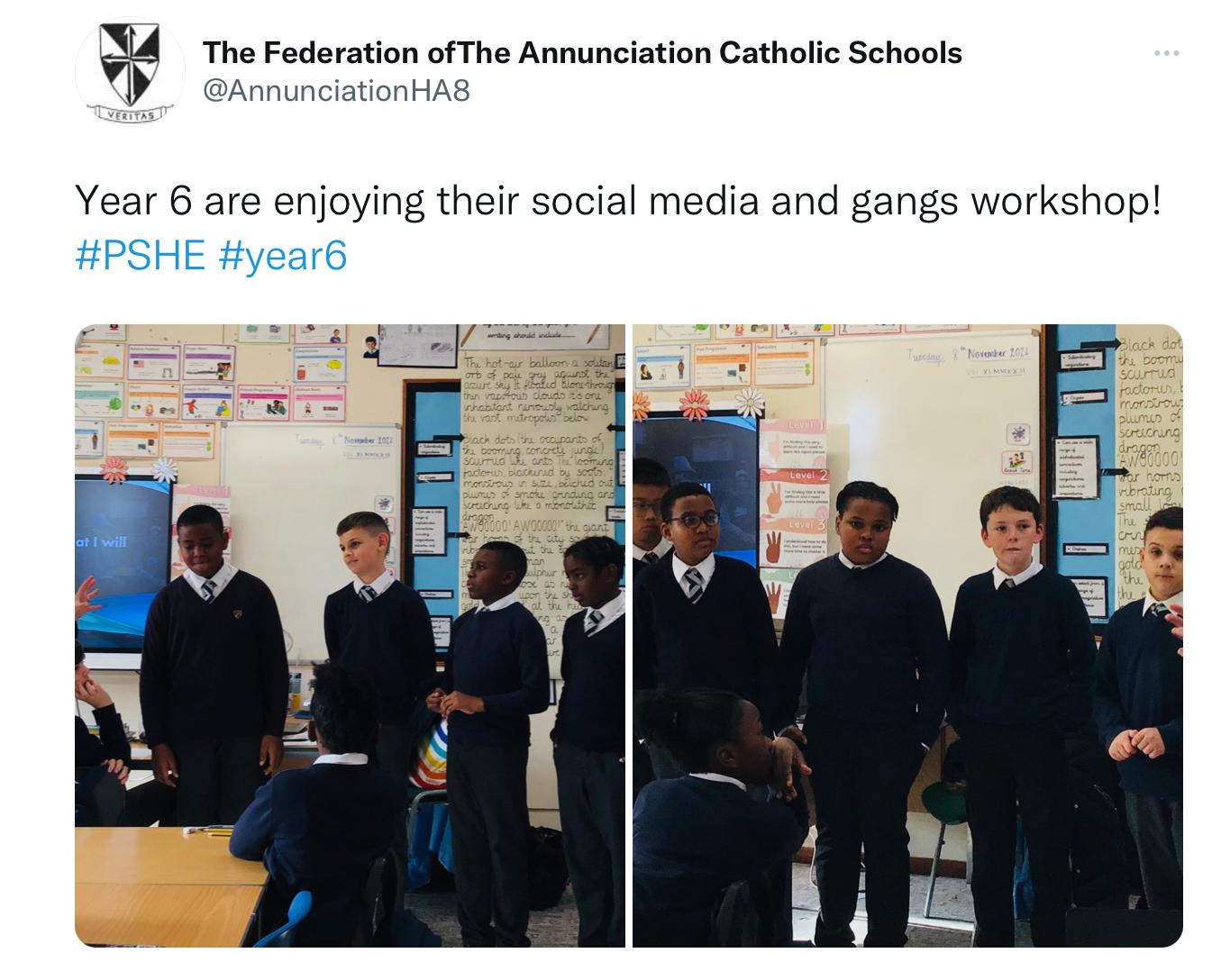 •    We have annual Police talks that cover keeping safe/online safety and we have used the Just Enough charity group to deliver workshops on gangs and modern slavery to UKS2.